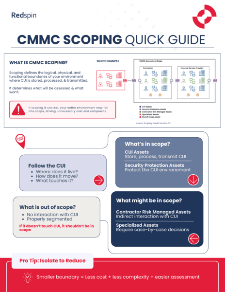 This quick guide explains how to define CMMC scope by following CUI, identifying what’s in and out of scope, and using PE and SC domains to establish clear, defensible boundaries.
